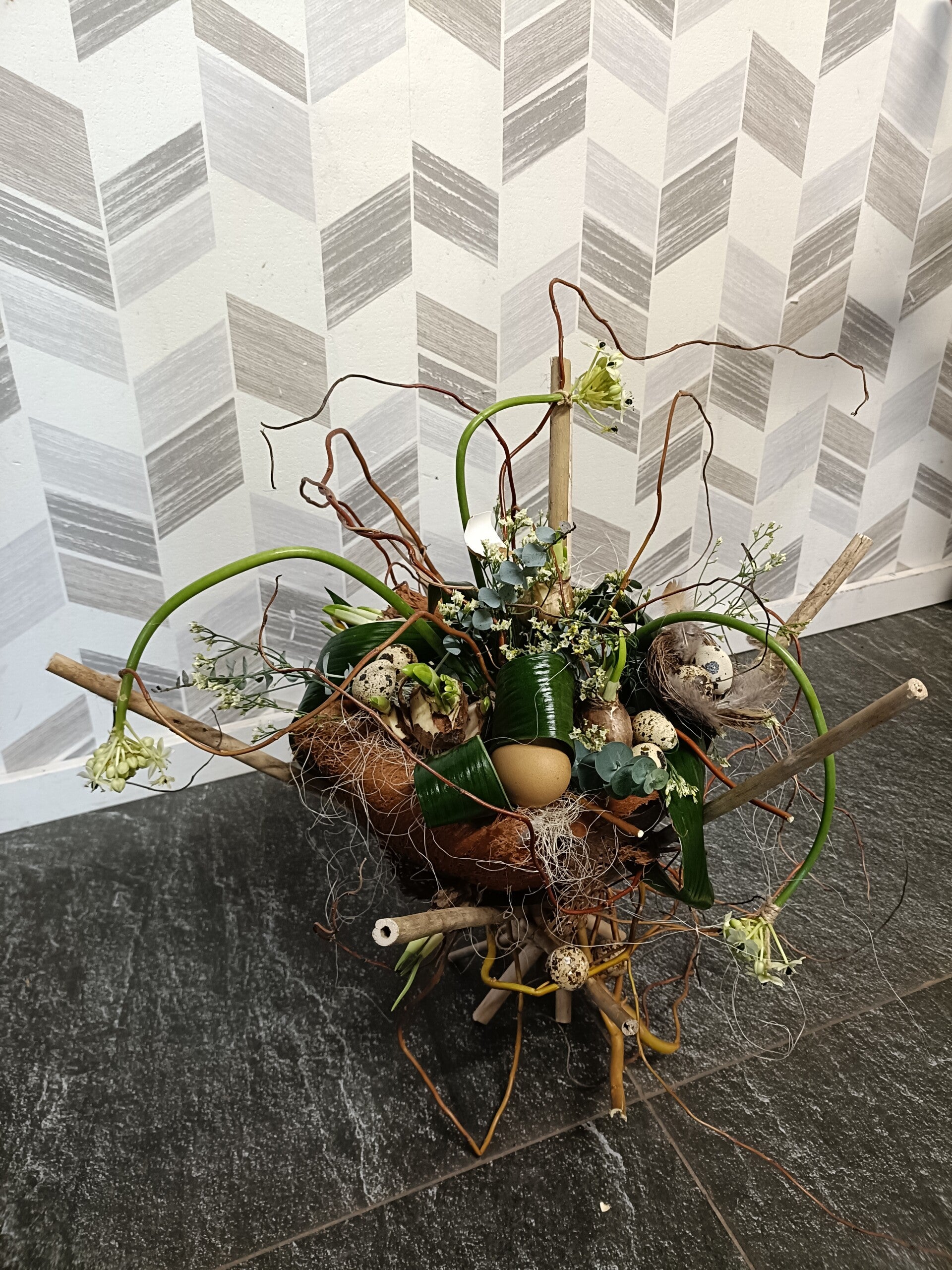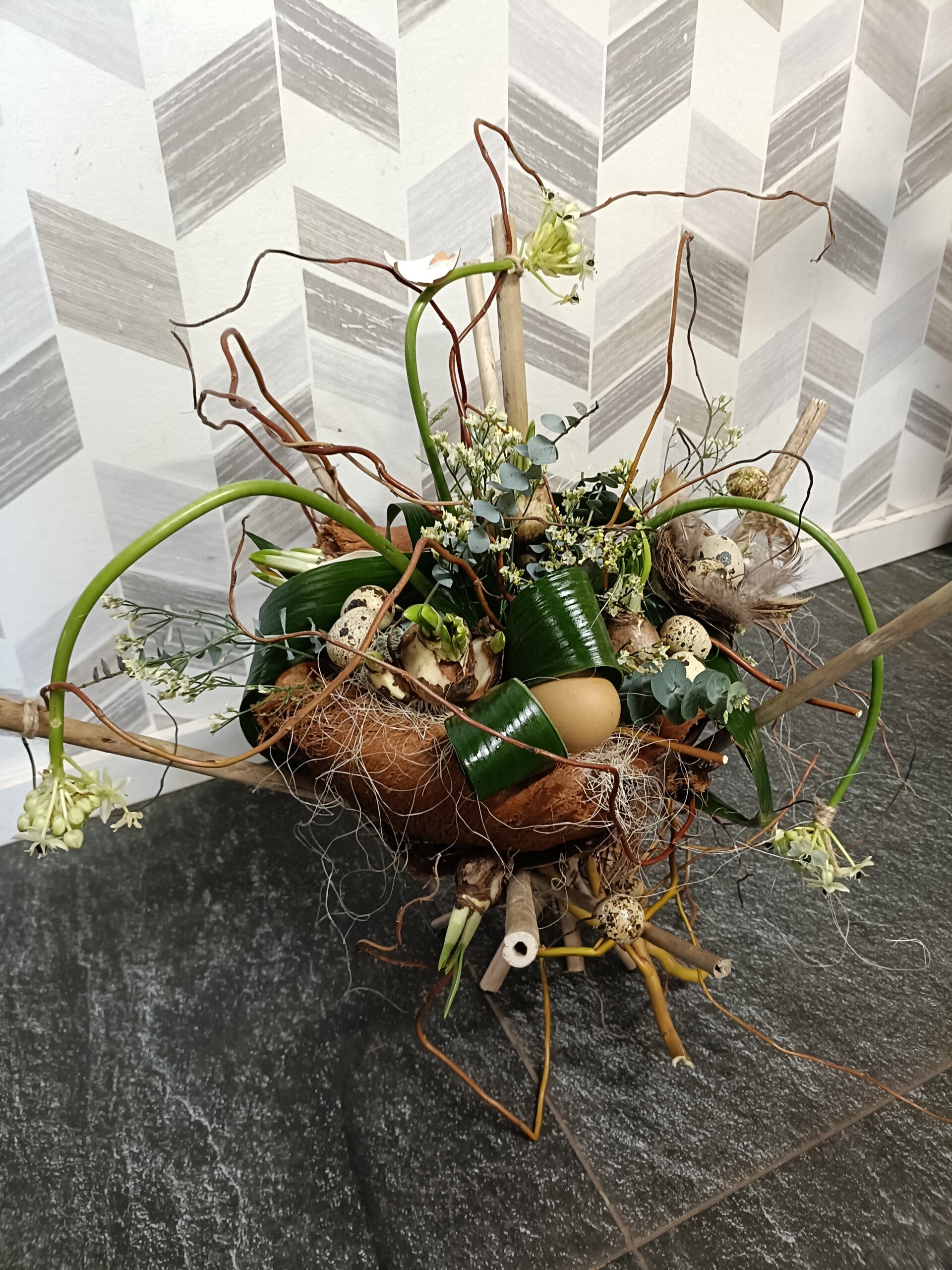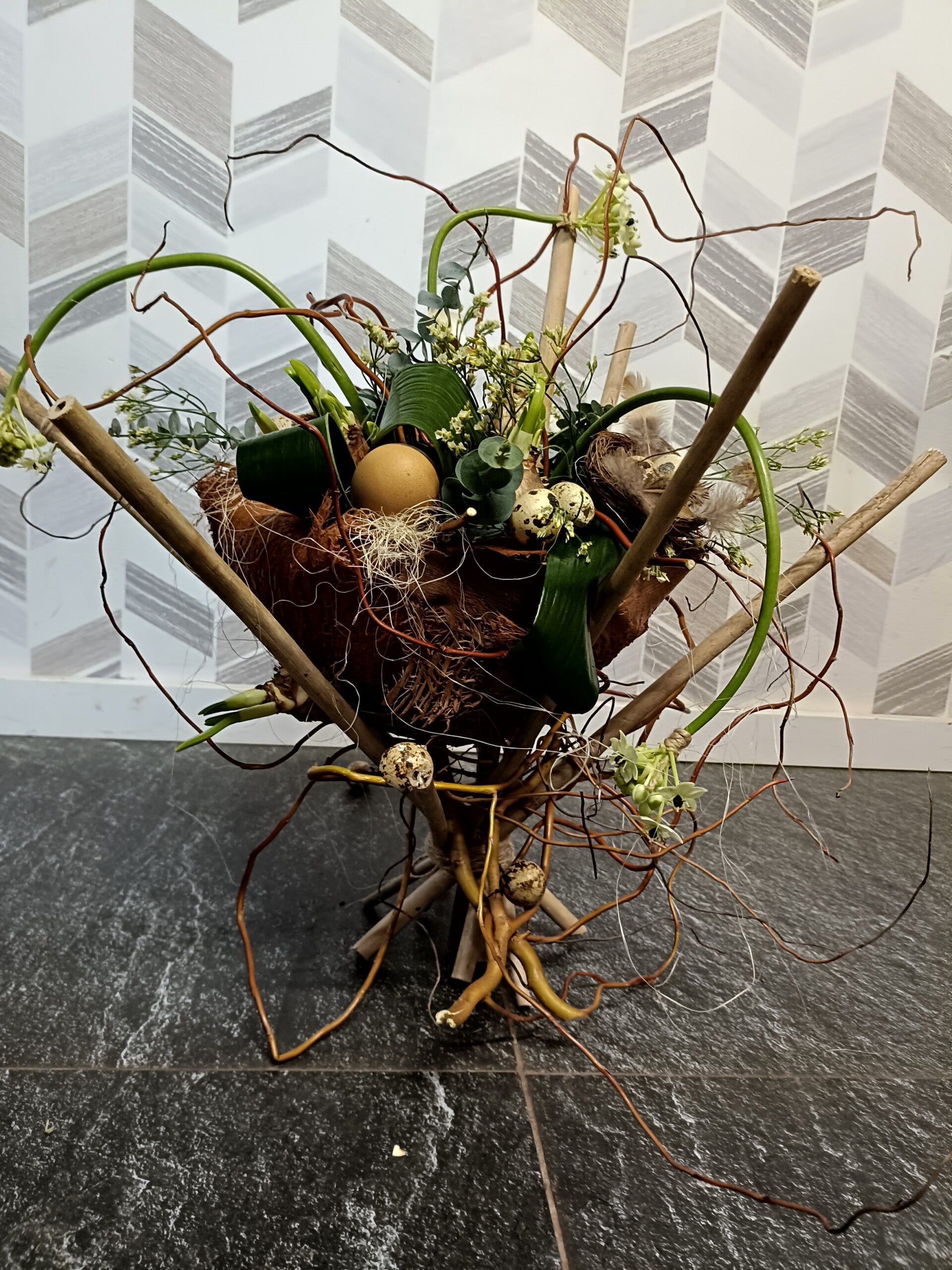 Vanuit de bol gaan we een bloemstuk maken, Tussendoor Decoreren, we leuke Kwartel eitjes, veertjes enz.